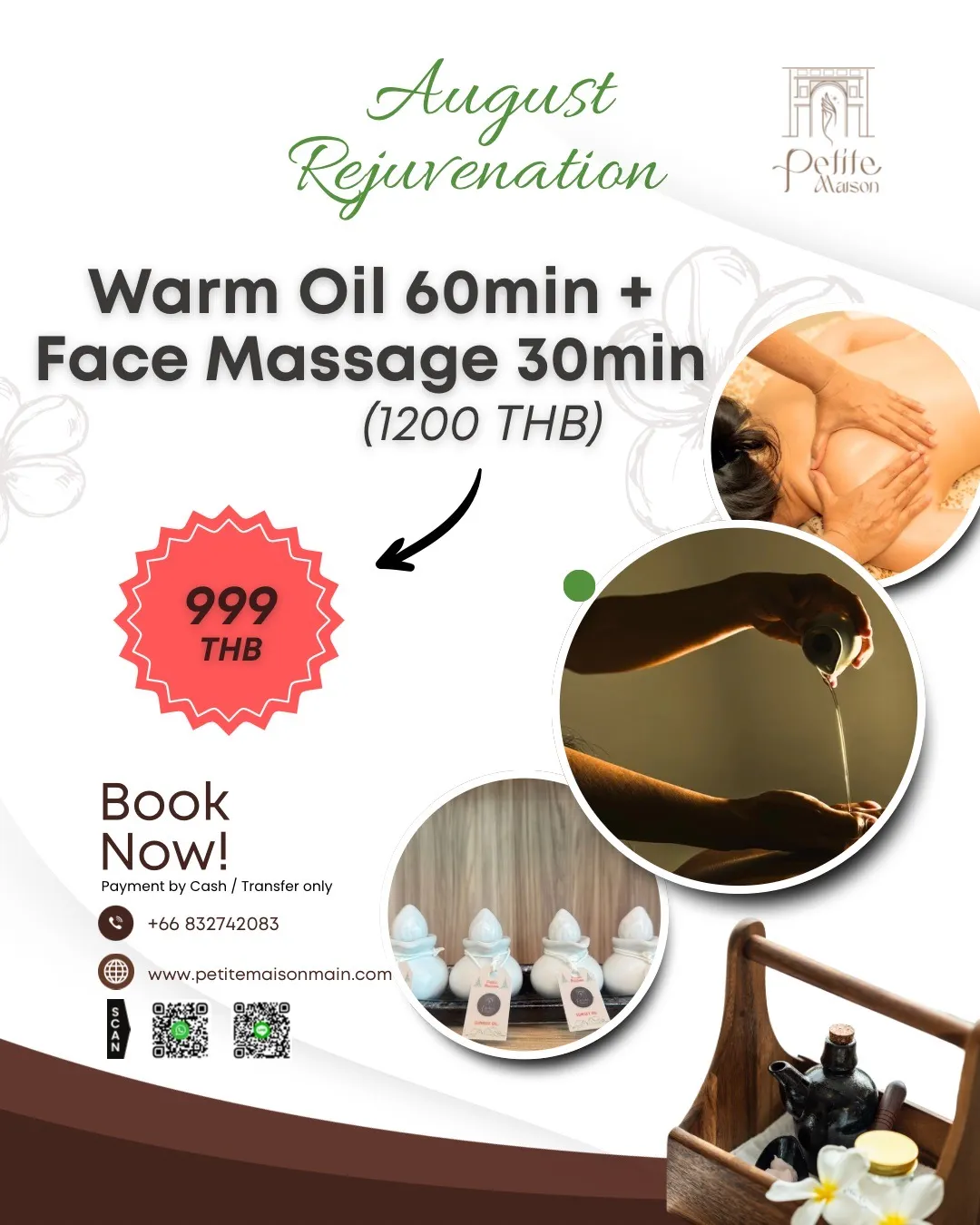 🌸 Warm Oil Massage 60 นาที + Face Massage 30 นาที